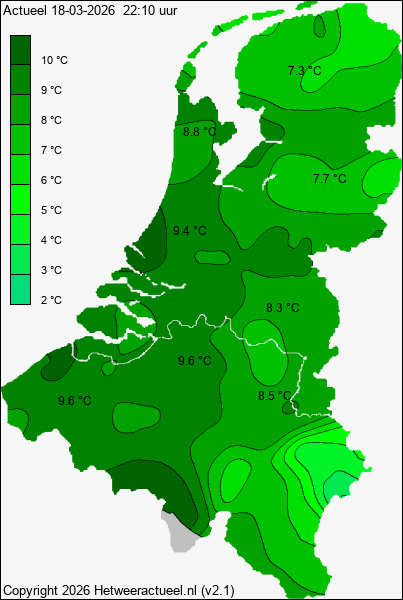 Het kaartje met de actuele temperatuur wordt iedere 10 minuten opgebouwd uit de actuele gegevens van alle weerstations, mits de data minder dan 1 uur oud is.