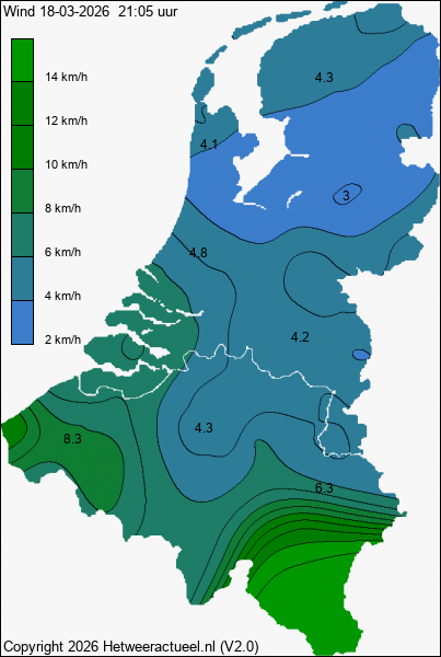 Het kaartje met de actuele wind windsneldheid (10 minuten gemiddelde) wordt 2 keer per uur opgebouwd uit de actuele gegevens van alle weerstations, mits de data minder dan 1 uur oud is.