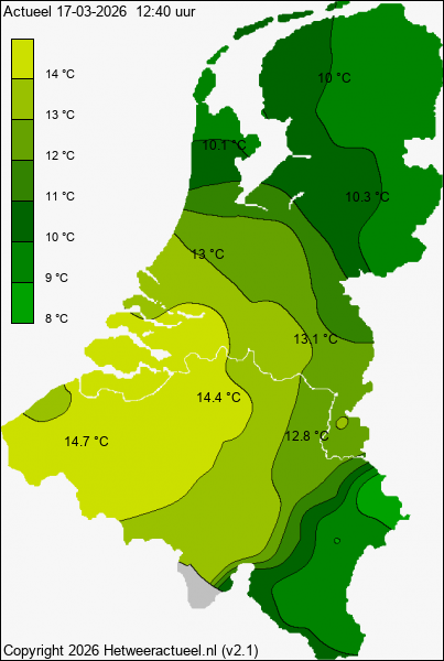 Het kaartje met de actuele temperatuur wordt iedere 10 minuten opgebouwd uit de actuele gegevens van alle weerstations, mits de data minder dan 1 uur oud is.