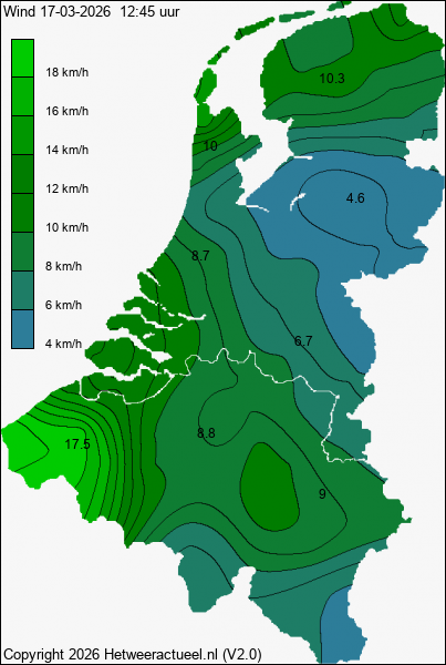 Het kaartje met de actuele wind windsneldheid (10 minuten gemiddelde) wordt 2 keer per uur opgebouwd uit de actuele gegevens van alle weerstations, mits de data minder dan 1 uur oud is.